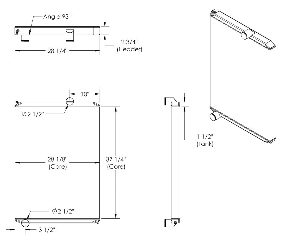 Technical diagram of radiator dimensions and specifications.