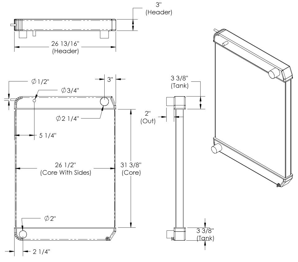 Technical drawing of vehicle radiator dimensions.